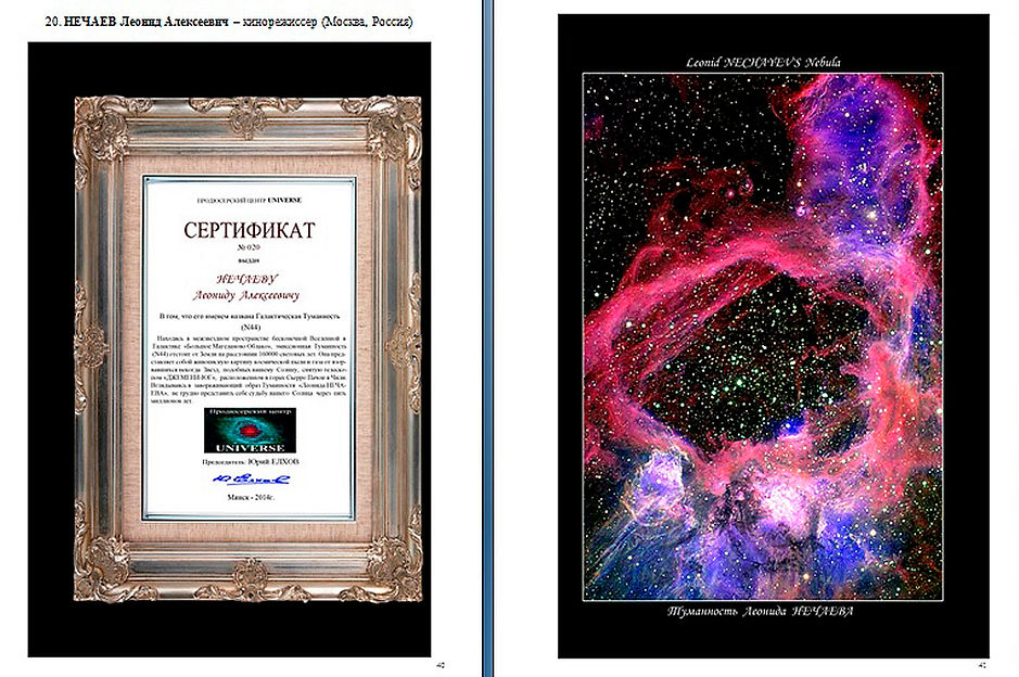 "СЕРТИФИКАТ выдан НЕЧАЕВУ Леониду Алексеевичу в том, что его именем названа Галактическая Туманность (N44).